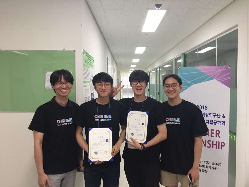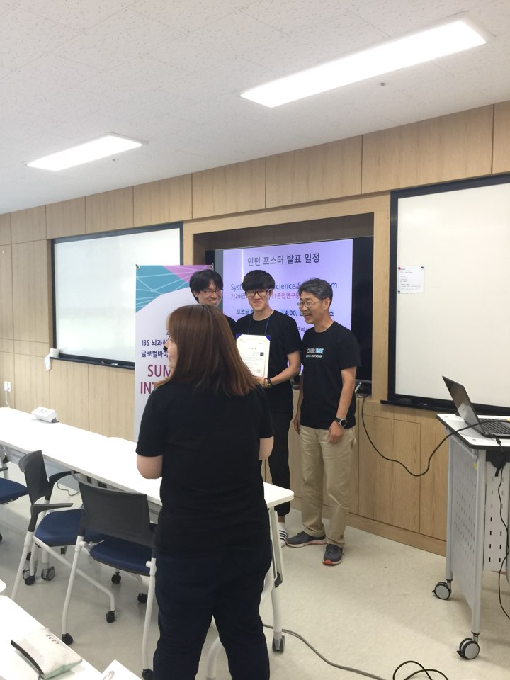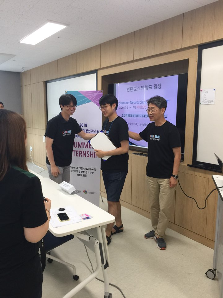 Mooyoung and Byeongjae finished a month of lab life, as a part of CNIR Summer Internship. They successfully conducted an experiment and presented a poster that studied the effect of temporal and directional expectations on the initiation of smooth pursuit eye movements, under the guidance of Joonsik and Jeongjun. Congratulations!!