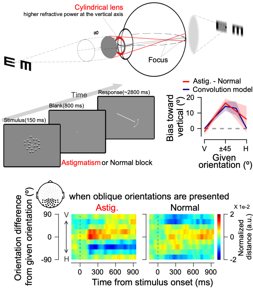 We investigate how astigmatism induced perceptual errors and biases are mediated by modulation of neural information using multivariate analysis of EEG activity.
